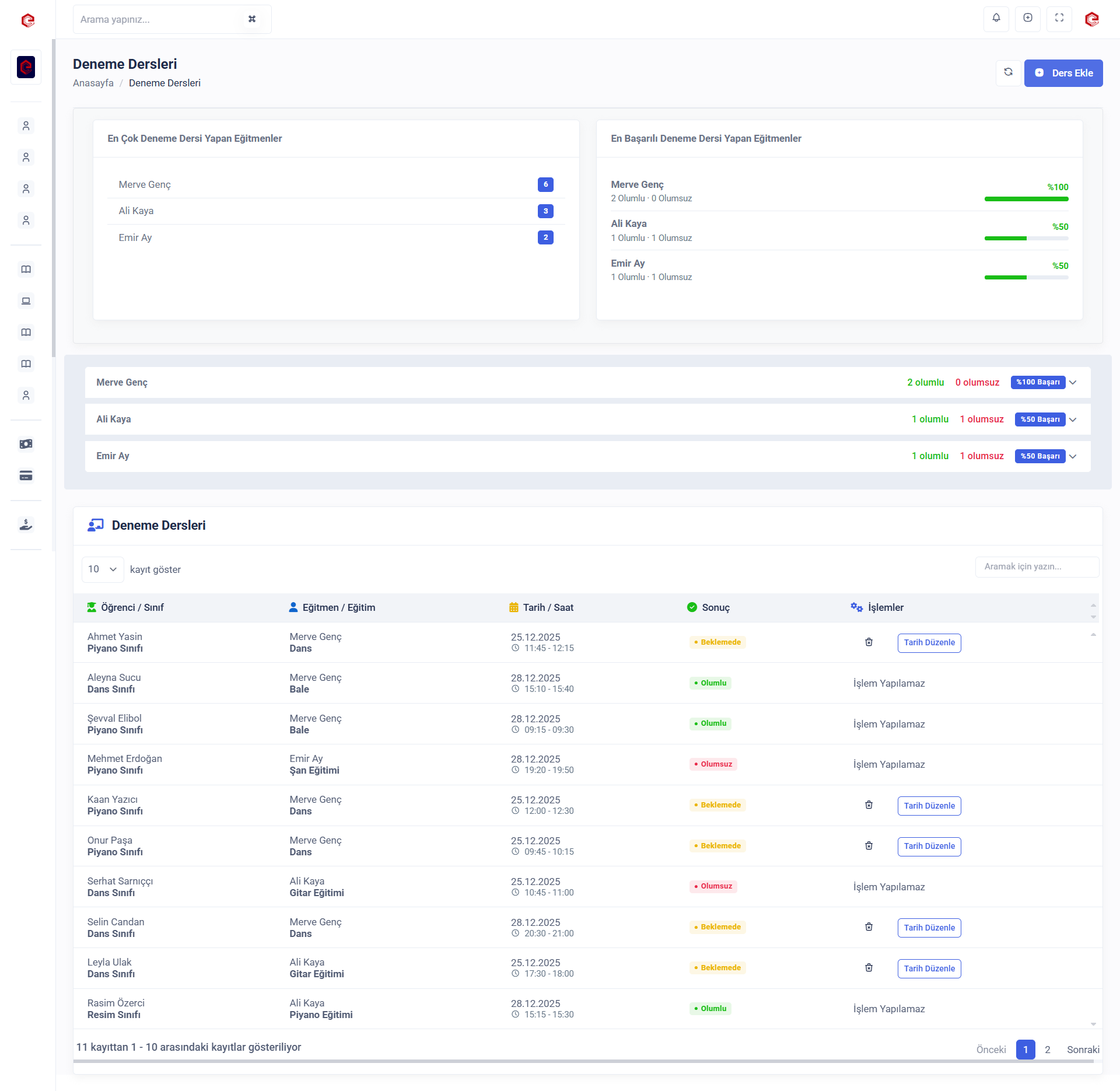 Kurumunuzdaki tüm deneme derslerini görüntüleyebilirsiniz. 'Ders Ekle' butonu ile içeriye deneme dersi ekleyebilirsiniz. Ders sonucunda öğrencinin kayıt olma durumuna göre 'olumlu' veya 'olumsuz' dönüş oranlarını takip edebilirsiniz.