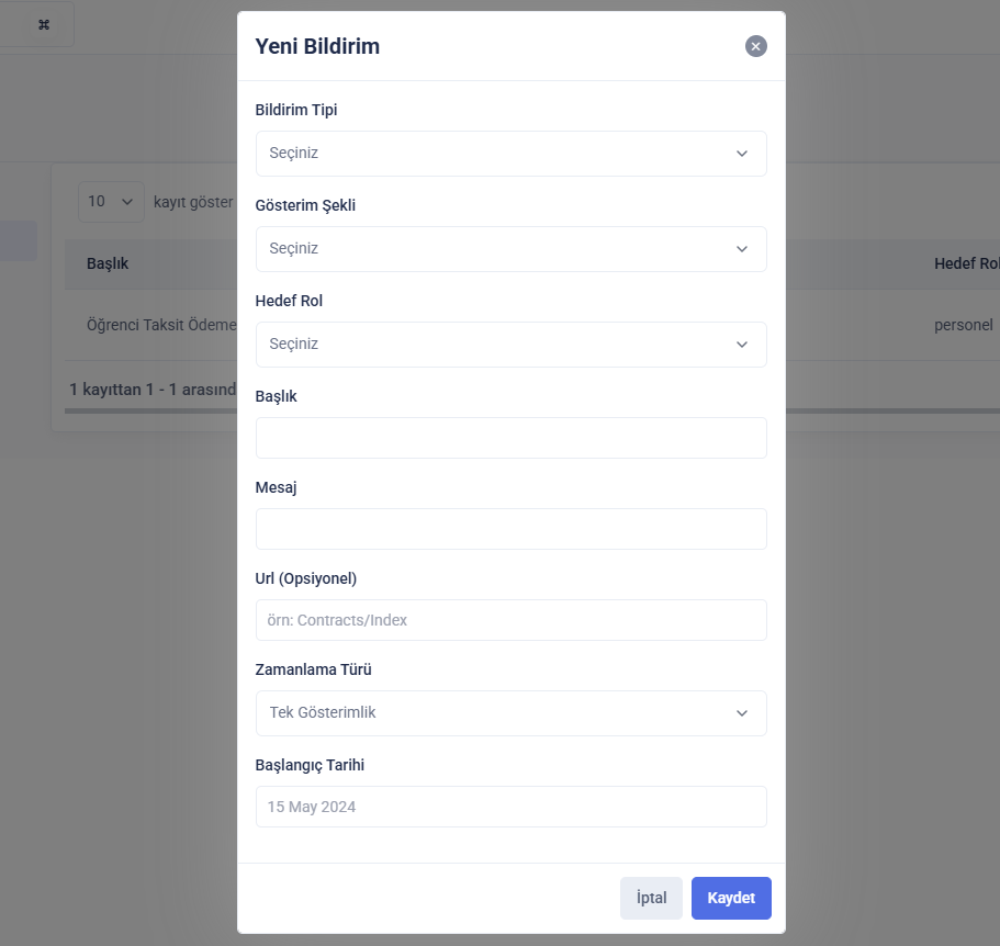 Modülün sunduğu esnek yapı sayesinde, genel duyurularınızdan kişiye özel hatırlatıcılara kadar tüm süreçleri tek bir panelden kontrol edebilirsiniz. Belirli hedef gruplarına yönelik tarih ayarlı bildirimler ile sınav tarihleri, ödeme hatırlatmaları veya önemli etkinlik duyuruları gibi kritik süreçleri otomatize ederek idari iş yükünüzü hafifletir ve kurum içi etkileşimi en üst seviyeye taşırsınız.