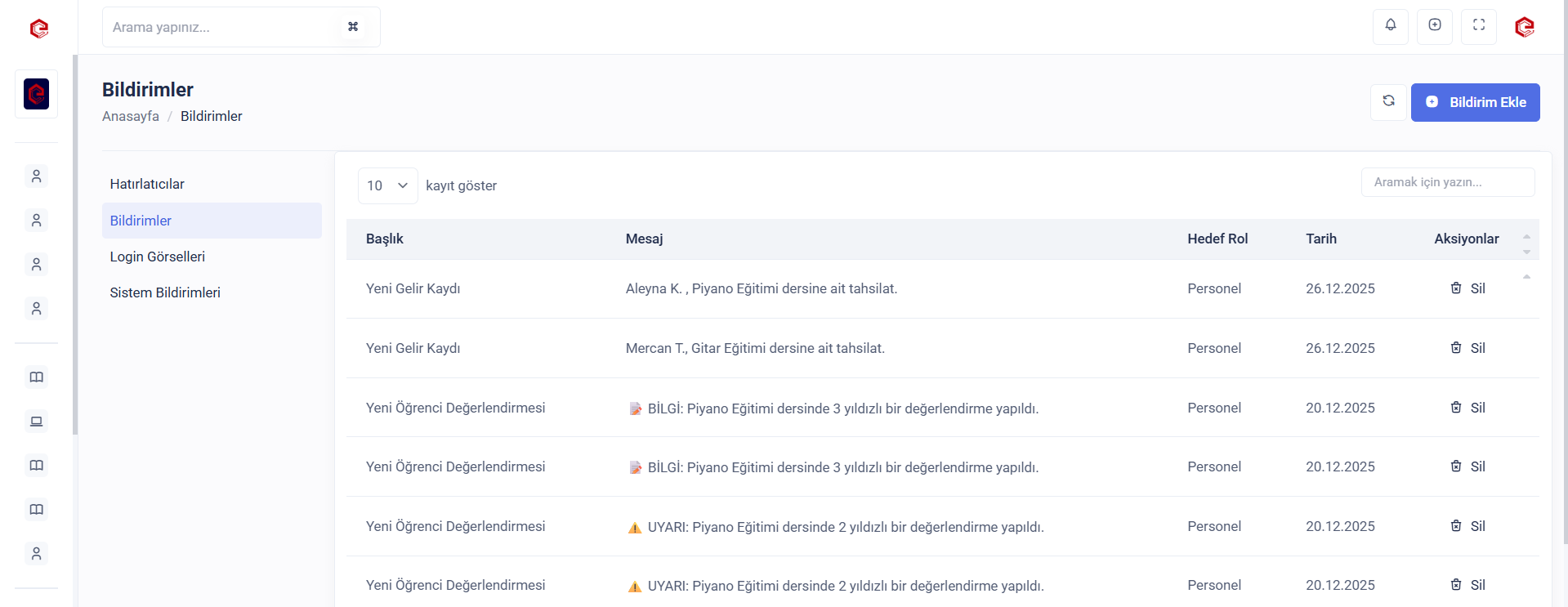 Dilerseniz genel, dilerseniz de belli bir hedef gruba yönelik (eğitmenler, öğrenciler vb.) dilediğiniz tarih veya tarih aralığında bir veya daha fazla gösterilebilen bildirimler ekleyebilirsiniz.
