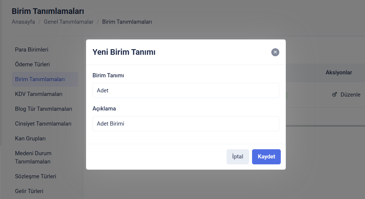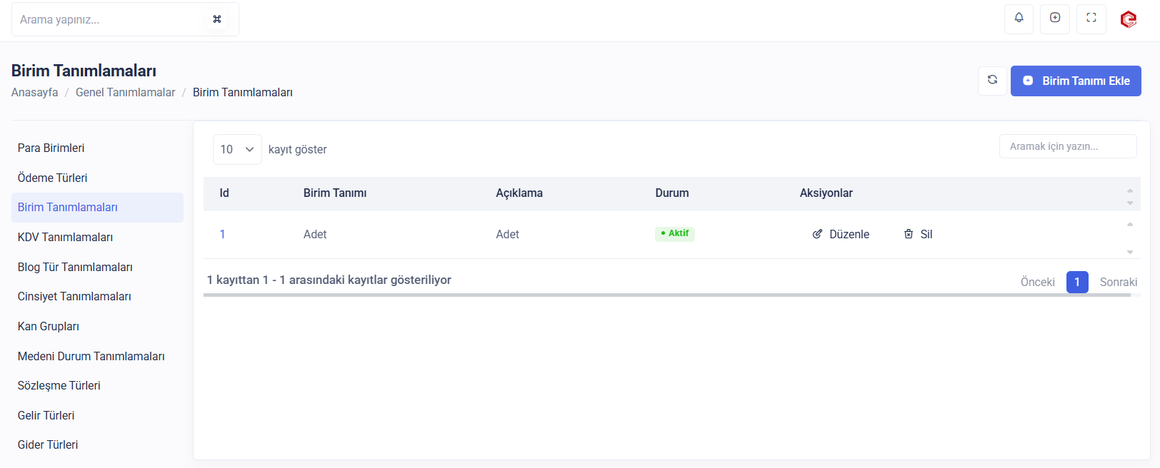Kurumunuzda eğitim, mali veya idari birimler için tanımlamalar ekleyebilir, güncelleyebilir veya silebilirsiniz.