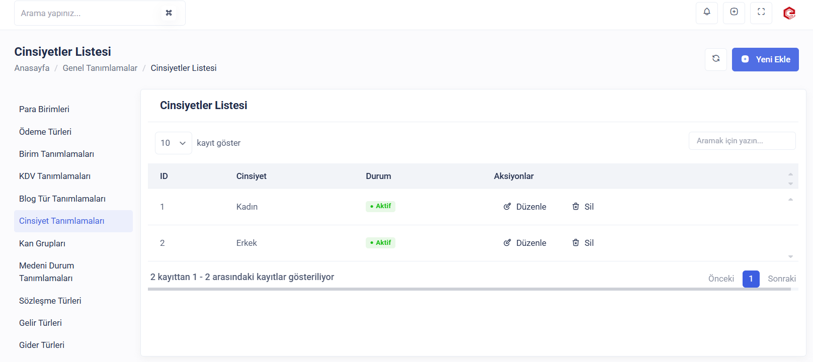 Kurumunuzda öğrenci ve çalışan kayıtlarında kullanılacak cinsiyet tanımlarını ekleyebilir, güncelleyebilir veya silebilirsiniz.