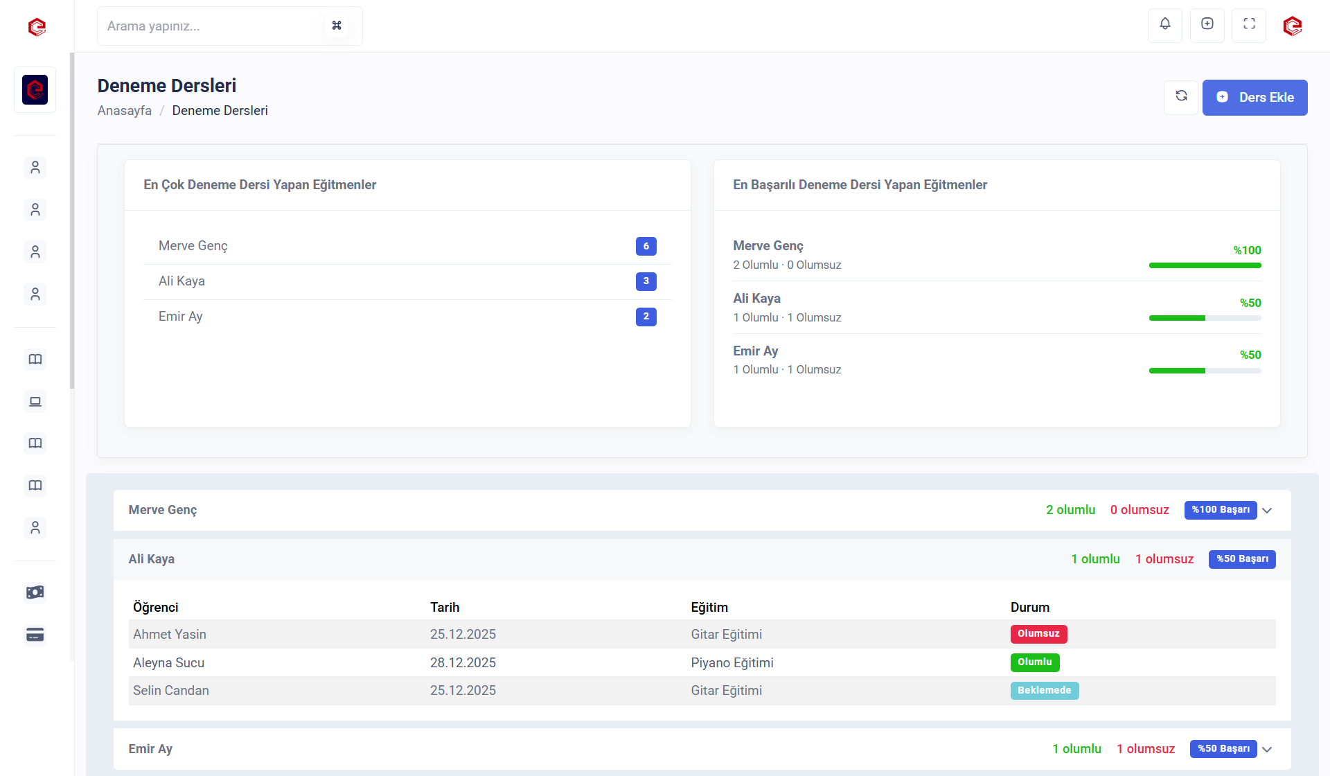 Kurumunuzdaki tüm deneme derslerini görüntüleyebilirsiniz. 'Ders Ekle' butonu ile içeriye deneme dersi ekleyebilirsiniz. Ders sonucunda öğrencinin kayıt olma durumuna göre 'olumlu' veya 'olumsuz' dönüş oranlarını takip edebilirsiniz.