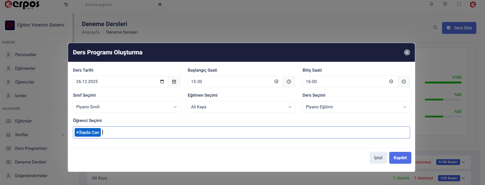 Kurumunuzun tüm deneme derslerini kolayca yönetebilirsiniz. Deneme derslerini oluşturabilir, olumlu dönüş oranlarını takip edebilir, eğitmen ve öğrencilerinizin takibini sağlayabilirsiniz.
