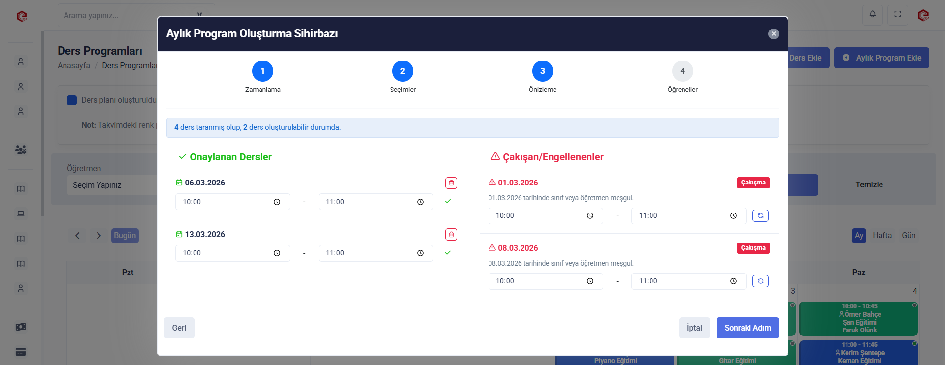 Belirlediğiniz adet miktarlarında aylık veya haftalık programlar oluşturabilirsiniz. Haftanın hangi günleri ve saatlerinde derslerin yapılacağını seçebilirsiniz. Dilerseniz saatleri ve tarihleri düzenleyebilir, çakışma olan dersleri yeniden programlayabilirsiniz. Ders programlarını boş bir şekilde öğrenci eklemeden de oluşturabilirsiniz.