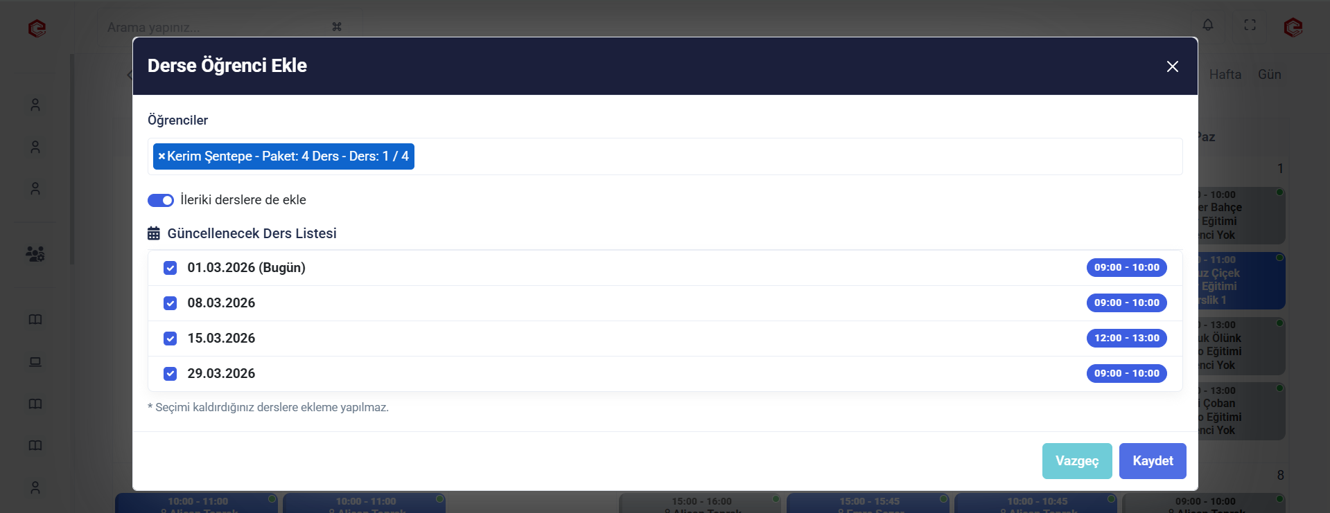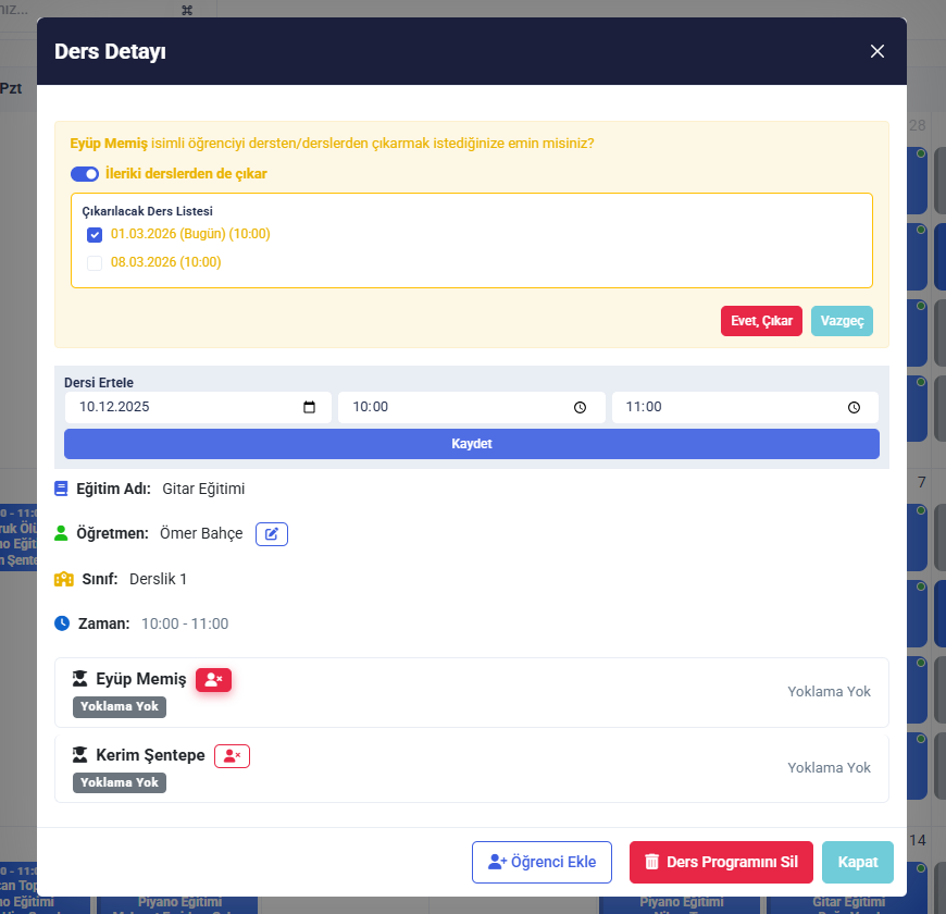 Seçtiğiniz dersteki öğrencileri silebilirsiniz. 'İleri tarihli derslerden de çıkar' seçeneği ile ilgili dersin ileri tarihli derslerinden de öğrencileri silebilirsiniz.