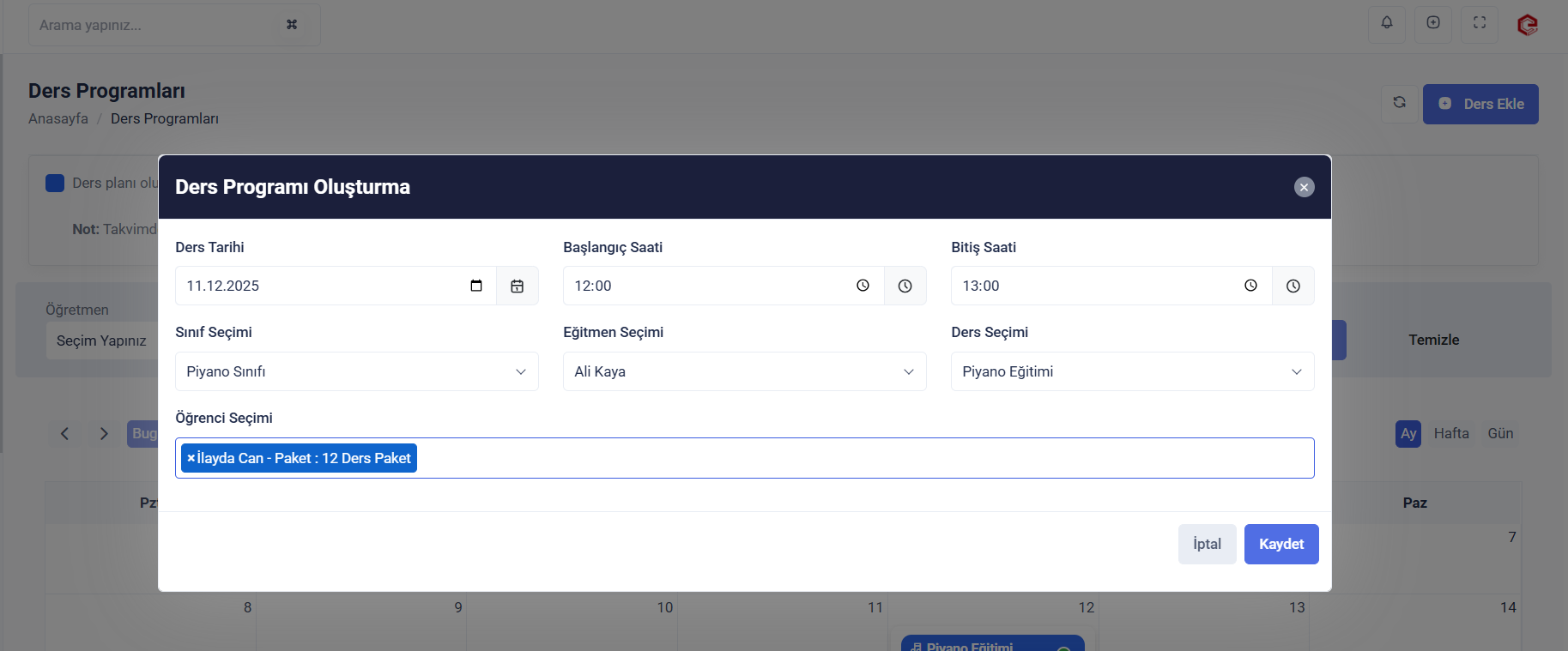 Öğrencilerinizin ve eğitmenlerinizin ders programlarını oluşturabilirsiniz. Program oluşturulurken ders çakışmaları, eğitmenlerin izin günleri, öğrencilerin ilgili eğitime ait paket bilgileri vb. durumlar sistem tarafından kontrol edilir ve problemler oluşmadan engellenmiş olunur.