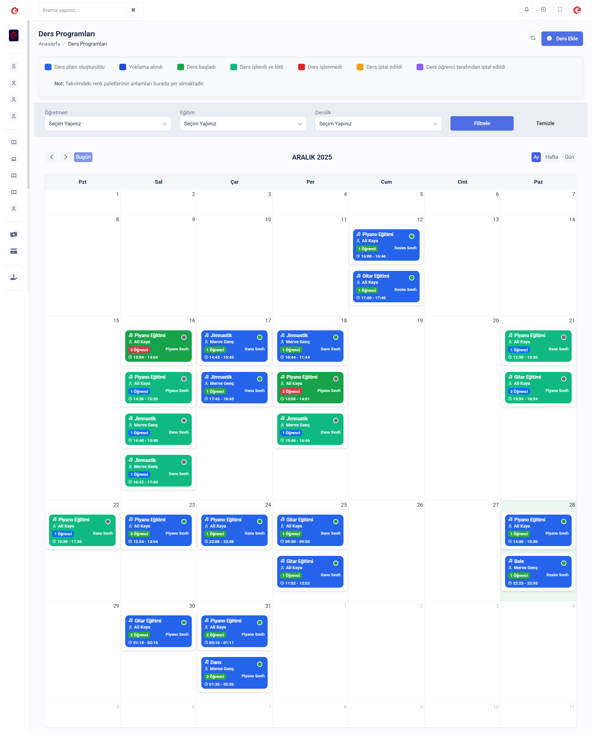Kurumunuzda eğitim alan tüm öğrencilerin ve eğitmenlerin ders programlarını görüntüleyebilirsiniz. 'Ders Ekle' butonu ile içeriye ders ekleyebilirsiniz. İstediğiniz türde filtreleme yapabilirsiniz.
