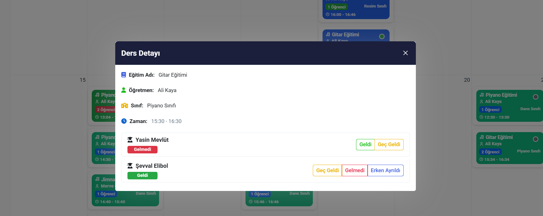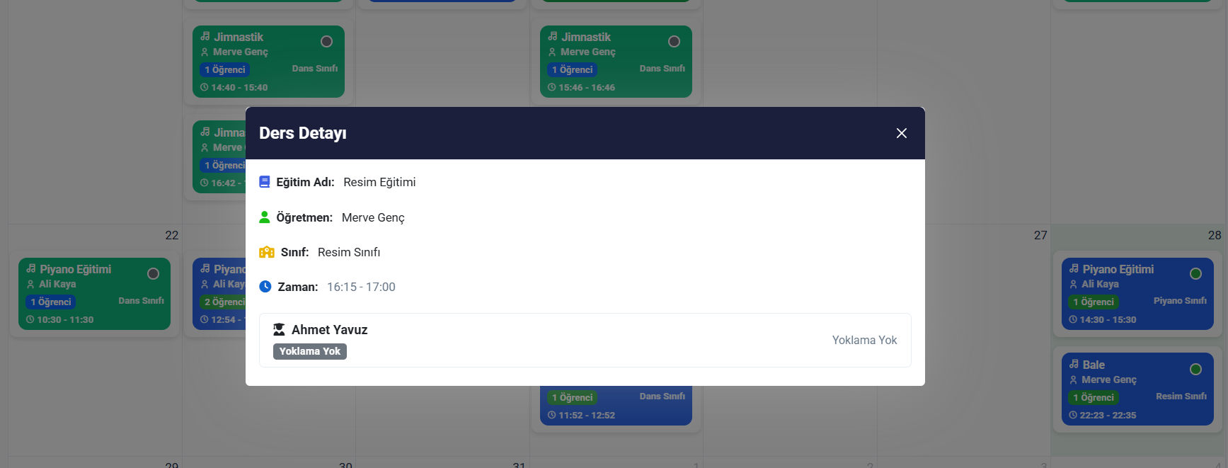 Öğrencilerinizin derslere katılım durularını görüntüleyebilirsiniz. Eğitmenin yoklama almadığı durumlarda geçmiş dersler ile ilgili yönetici de yoklama alabilir.