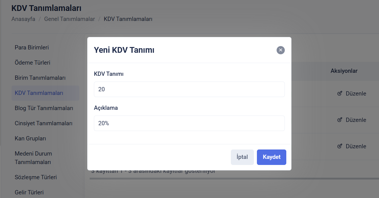 KDV Tanımlamaları Yönetimi