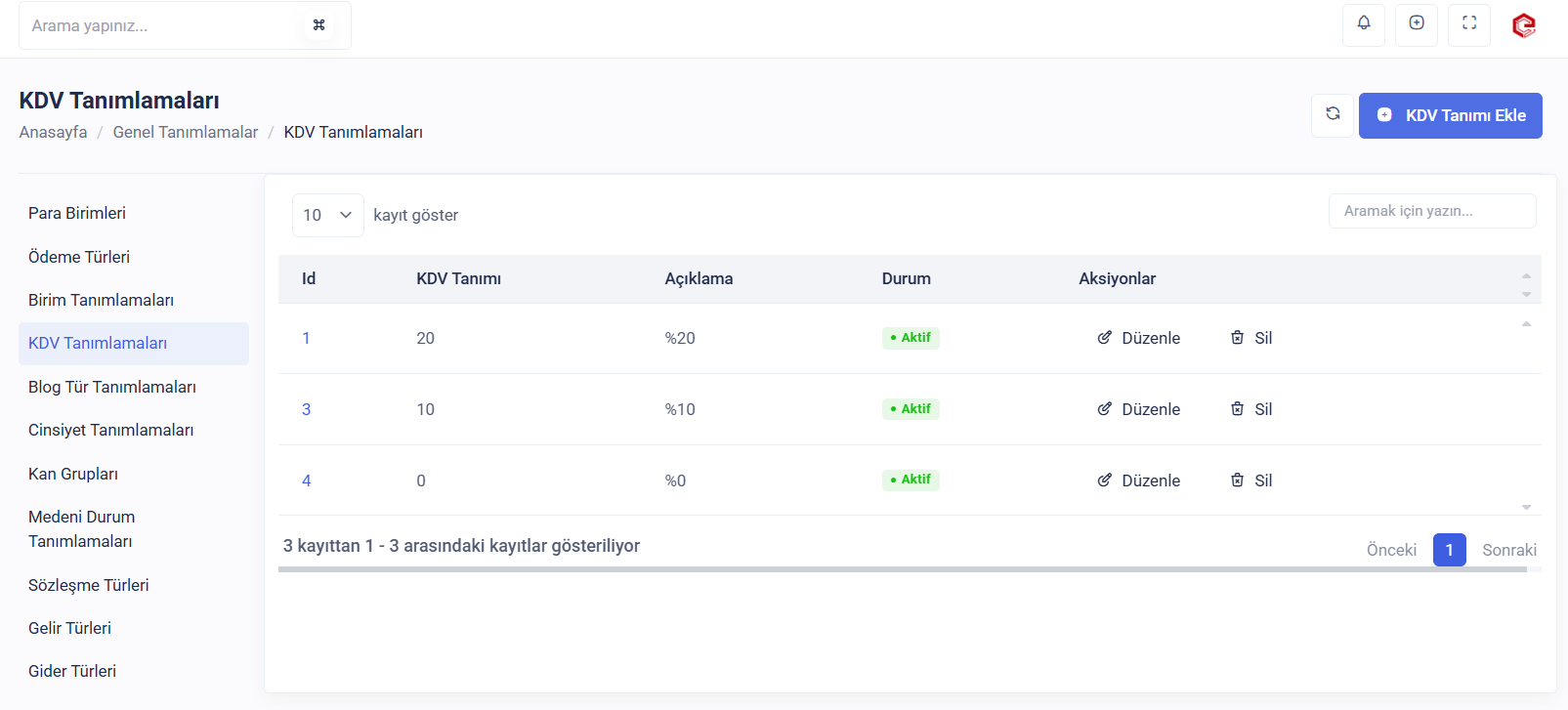 Kurumunuzda finansal işlemler için kdv tanımlamaları ekleyebilir, güncelleyebilir veya silebilirsiniz.